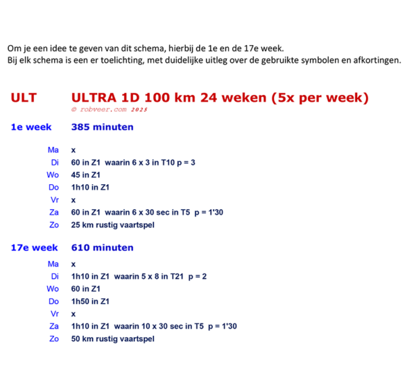 Het schema is geschikt voor hardlopers die momenteel ten minste 30 km probleemloos kunnen hardlopen en bij voorkeur ervaring hebben met wat kortere Ultra’s van 60 à 80 km. Het schema werkt in 24 weken toe naar een ultraloop van 100 km (en is daarmee is dit schema ook geschikt om je voor te bereiden op Ultra’s van pakweg 80 tot pakweg 120 km).