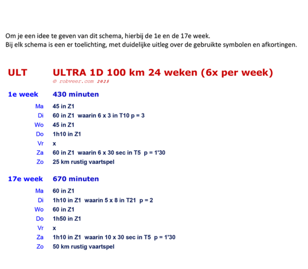 Het schema is geschikt voor hardlopers die momenteel ten minste 30 km probleemloos kunnen hardlopen en bij voorkeur ervaring hebben met wat kortere Ultra’s van 60 à 80 km. Het schema werkt in 24 weken toe naar een ultraloop van 100 km (en is daarmee is dit schema ook geschikt om je voor te bereiden op Ultra’s van pakweg 80 tot pakweg 120 km).