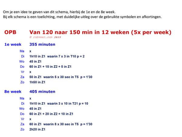 Het schema is geschikt voor hardlopers die zonder problemen twee uur lang onafgebroken kunnen hardlopen. Elke week worden er vijf hardlooptrainingen gedaan. In 12 weken werk je toe naar een niveau waarop je tweeënhalf uur onafgebroken kunt hardlopen.
