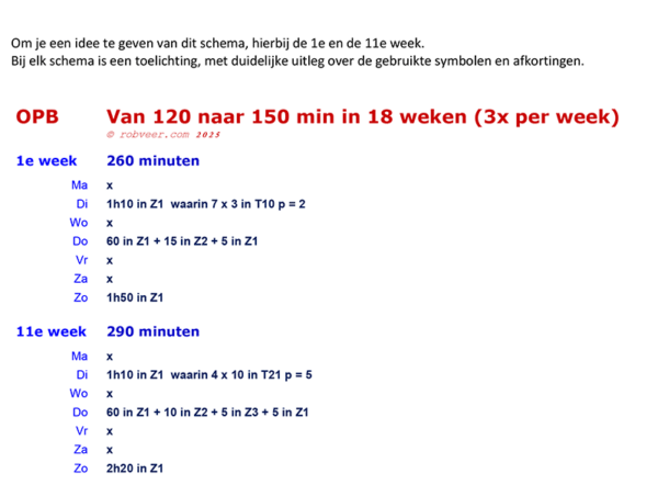 et schema is geschikt voor hardlopers die zonder problemen twee uur lang onafgebroken kunnen hardlopen. Elke week worden er drie hardlooptrainingen gedaan. In 18 weken werk je toe naar een niveau waarop je tweeënhalf uur onafgebroken kunt hardlopen.