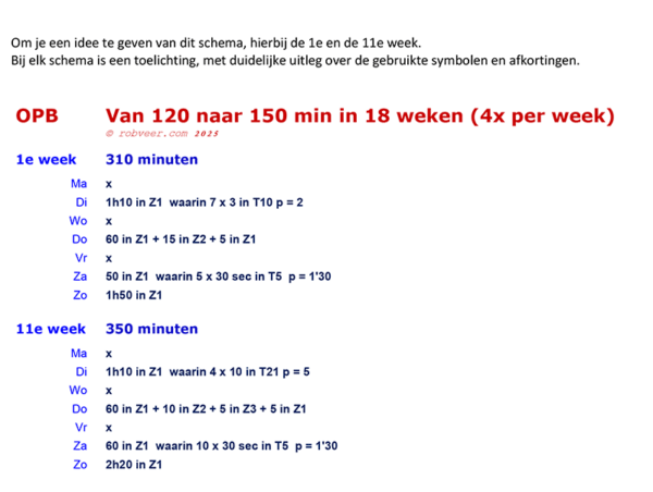 Het schema is geschikt voor hardlopers die zonder problemen twee uur lang onafgebroken kunnen hardlopen. Elke week worden er vier hardlooptrainingen gedaan. In 18 weken werk je toe naar een niveau waarop je tweeënhalf uur onafgebroken kunt hardlopen.