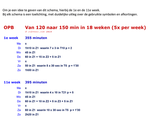 Het schema is geschikt voor hardlopers die zonder problemen twee uur lang onafgebroken kunnen hardlopen. Elke week worden er vijf hardlooptrainingen gedaan. In 18 weken werk je toe naar een niveau waarop je tweeënhalf uur onafgebroken kunt hardlopen.