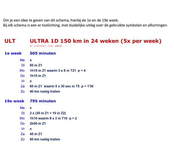 Het schema is geschikt voor hardlopers die momenteel ten minste 42 km probleemloos kunnen hardlopen en bij voorkeur ervaring hebben met wat langere Ultra’s van 80 à 100 km. Het schema werkt in 24 weken toe naar een ultraloop van 150 km (en is daarmee is dit schema ook geschikt om je voor te bereiden op Ultra’s van pakweg 120 tot pakweg 180 km).