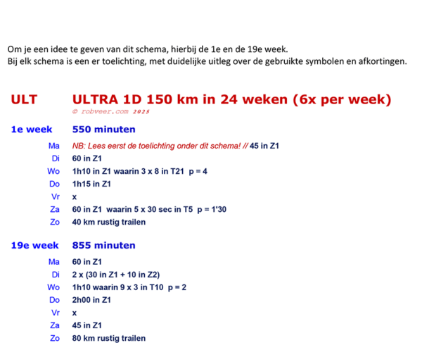 Het schema is geschikt voor hardlopers die momenteel ten minste 42 km probleemloos kunnen hardlopen en bij voorkeur ervaring hebben met wat langere Ultra’s van 80 à 100 km. Het schema werkt in 24 weken toe naar een ultraloop van 150 km (en is daarmee is dit schema ook geschikt om je voor te bereiden op Ultra’s van pakweg 120 tot pakweg 180 km).
