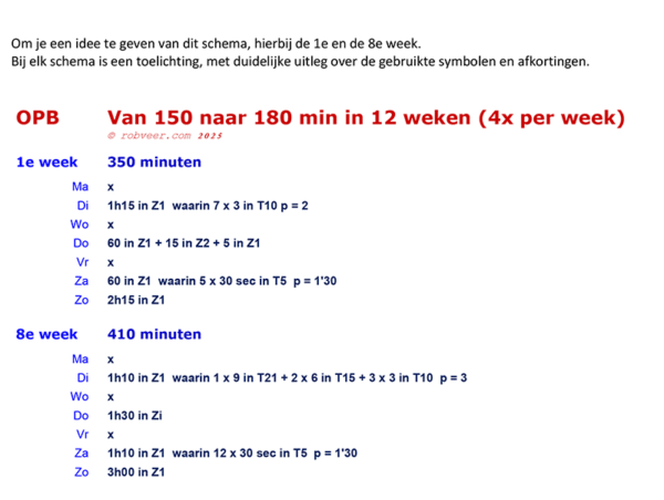 Het schema is geschikt voor hardlopers die zonder problemen twee en half uur lang onafgebroken kunnen hardlopen. Elke week worden er vier hardlooptrainingen gedaan. In 12 weken werk je toe naar een niveau waarop je drie uur onafgebroken kunt hardlopen.