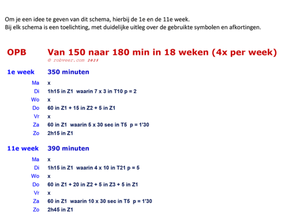 Het schema is geschikt voor hardlopers die zonder problemen twee en half uur lang onafgebroken kunnen hardlopen. Elke week worden er vier hardlooptrainingen gedaan. In 18 weken werk je toe naar een niveau waarop je drie uur onafgebroken kunt hardlopen.