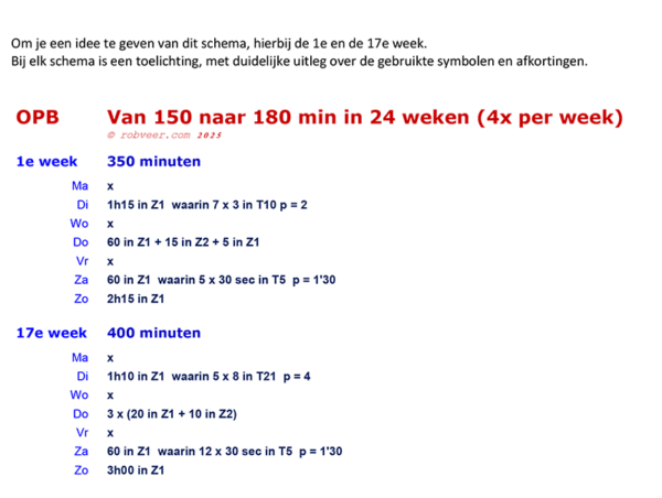 Het schema is geschikt voor hardlopers die zonder problemen twee en half uur lang onafgebroken kunnen hardlopen. Elke week worden er vier hardlooptrainingen gedaan. In 24 weken werk je toe naar een niveau waarop je drie uur onafgebroken kunt hardlopen.