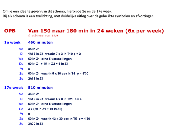 Het schema is geschikt voor hardlopers die zonder problemen twee en half uur lang onafgebroken kunnen hardlopen. Elke week worden er zes hardlooptrainingen gedaan. In 24 weken werk je toe naar een niveau waarop je drie uur onafgebroken kunt hardlopen.