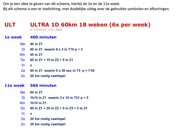 Het schema is geschikt voor hardlopers die zonder problemen 30 km onafgebroken kunnen hardlopen. Het schema werkt in 18 weken toe naar een ultraloop van 60 km (en is daarmee ook geschikt voor ULTRA’s van pakweg 50 tot pakweg 70 km. Wekelijks staan er zes hardlooptrainingen op het programma.