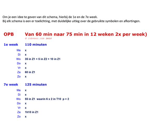 Het schema is geschikt voor hardlopers die zonder problemen een uur lang onafgebroken kunnen hardlopen. Elke week worden er twee hardlooptrainingen gedaan. In 12 weken werk je toe naar een niveau waarop je 1h15 onafgebroken kunt hardlopen.