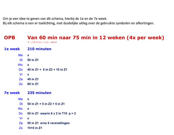 Het schema is geschikt voor hardlopers die zonder problemen een uur lang onafgebroken kunnen hardlopen. Elke week worden er vier hardlooptrainingen gedaan. In 12 weken werk je toe naar een niveau waarop je 1h15 onafgebroken kunt hardlopen.