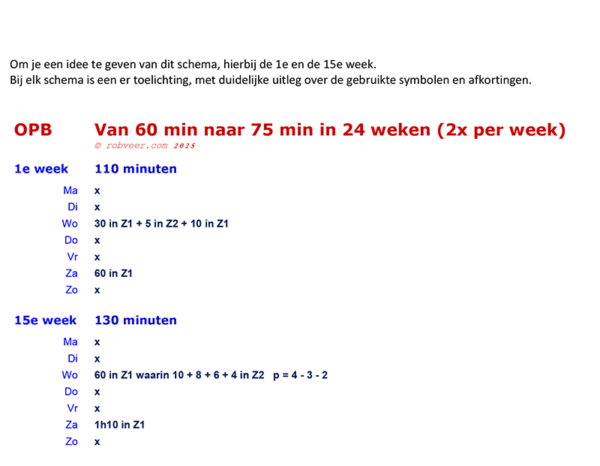Het schema is geschikt voor hardlopers die zonder problemen een uur lang onafgebroken kunnen hardlopen. Elke week worden er twee hardlooptrainingen gedaan. In 24 weken werk je toe naar een niveau waarop je 1h15 onafgebroken kunt hardlopen.