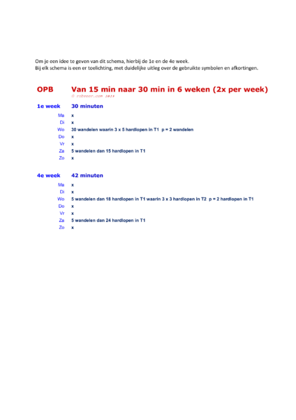 Het schema is geschikt voor hardlopers die zonder problemen een kwartier onafgebroken kunnen hardlopen. In 6 weken werk je toe naar een niveau waarop je een half uur onafgebroken kunt hardlopen. Elke week worden er twee hardlooptrainingen gedaan. Wil je liever wat minder snel opbouwen, kies dan de variant ‘in 12 weken’. De trainingen bestaan uit een combinatie van wandelen en hardlopen. Om je lichaam te laten wennen aan de inspanningen die gaan komen, is het belangrijk de gehele training, inclusief het wandelen, te volbrengen. Naarmate je verder in het schema komt, neemt de tijd dat je hardloopt geleidelijk toe. Het wandelen wordt langzaam afgebouwd.