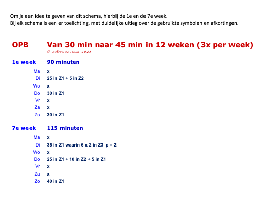 Dit schema is geschikt voor hardlopers die zonder problemen 30 minuten onafgebroken kunnen hardlopen. Elke week worden er drie hardlooptrainingen gedaan. In 12 weken werk je toe naar een niveau waarop je 45 minuten onafgebroken kunt hardlopen. Wil je rustiger opbouwen, kies dan de variant ‘in 18 weken’.