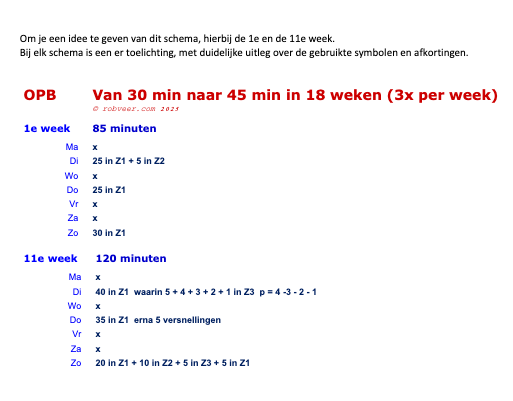 Dit schema is geschikt voor hardlopers die zonder problemen 30 minuten onafgebroken kunnen hardlopen. Elke week worden er drie hardlooptrainingen gedaan. In 18 weken werk je toe naar een niveau waarop je 45 minuten onafgebroken kunt hardlopen. Wil je sneller opbouwen, kies dan de variant ‘in 12 weken’.
