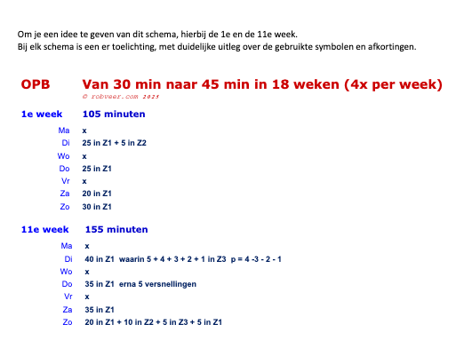 Dit schema is geschikt voor hardlopers die zonder problemen 30 minuten onafgebroken kunnen hardlopen. Elke week worden er vier hardlooptrainingen gedaan. In 18 weken werk je toe naar een niveau waarop je 45 minuten onafgebroken kunt hardlopen. Wil je sneller opbouwen, kies dan de variant ‘in 12 weken’.
