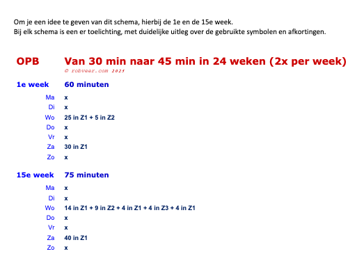 Dit schema is geschikt voor hardlopers die zonder problemen 30 minuten onafgebroken kunnen hardlopen. Elke week worden er twee hardlooptrainingen gedaan. In 24 weken werk je toe naar een niveau waarop je 45 minuten onafgebroken kunt hardlopen. Wil je sneller opbouwen, kies dan de variant ‘in 18 weken’.