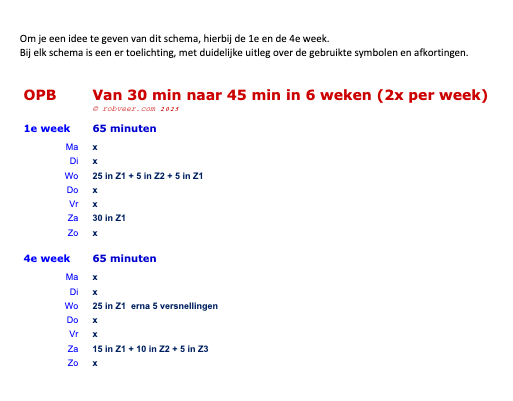 Het schema is geschikt voor hardlopers die zonder problemen 30 minuten onafgebroken kunnen hardlopen. Elke week worden er twee hardlooptrainingen gedaan. In 6 weken werk je toe naar een niveau waarop je 45 minuten onafgebroken kunt hardlopen. Wil je rustiger opbouwen, kies dan de variant ‘in 12 weken’.