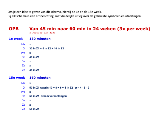 Dit schema is geschikt voor hardlopers die zonder problemen 45 minuten onafgebroken kunnen hardlopen. Elke week worden er drie hardlooptrainingen gedaan. In 24 weken werk je toe naar een niveau waarop je 60 minuten onafgebroken kunt hardlopen. Wil je wat sneller opbouwen, kies dan de variant ‘in 18 weken’.
