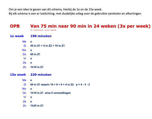 Het schema is geschikt voor hardlopers die zonder problemen 75 minuten lang onafgebroken kunnen hardlopen. Elke week worden er drie hardlooptrainingen gedaan. In 24 weken werk je toe naar een niveau waarop je anderhalf uur onafgebroken kunt hardlopen. Wil je sneller opbouwen, kies dan de variant ‘in 18 weken’. van 75 min naar 90 minuten in 24 weken (3x per week) Het schema is geschikt voor hardlopers die zonder problemen 75 minuten lang onafgebroken kunnen hardlopen. Elke week worden er drie hardlooptrainingen gedaan. In 24 weken werk je toe naar een niveau waarop je anderhalf uur onafgebroken kunt hardlopen. Wil je sneller opbouwen, kies dan de variant ‘in 18 weken’.