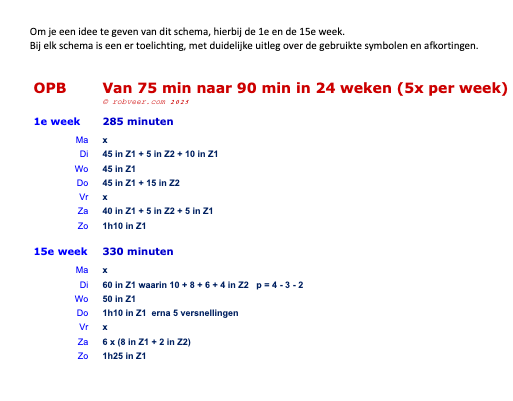 Het schema is geschikt voor hardlopers die zonder problemen 75 minuten lang onafgebroken kunnen hardlopen. Elke week worden er vijf hardlooptrainingen gedaan. In 24 weken werk je toe naar een niveau waarop je anderhalf uur onafgebroken kunt hardlopen. Wil je sneller opbouwen, kies dan de variant ‘in 18 weken’.
