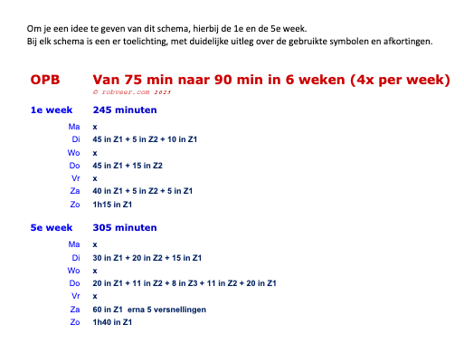 Het schema is geschikt voor hardlopers die zonder problemen 75 minuten lang onafgebroken kunnen hardlopen. Elke week worden er vier hardlooptrainingen gedaan. In 6 weken werk je toe naar een niveau waarop je anderhalf uur onafgebroken kunt hardlopen. Wil je rustiger opbouwen, kies dan de variant ‘in 12 weken’.