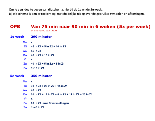 Het schema is geschikt voor hardlopers die zonder problemen 75 minuten lang onafgebroken kunnen hardlopen. Elke week worden er vijf hardlooptrainingen gedaan. In 6 weken werk je toe naar een niveau waarop je anderhalf uur onafgebroken kunt hardlopen. Wil je rustiger opbouwen, kies dan de variant ‘in 12 weken’.