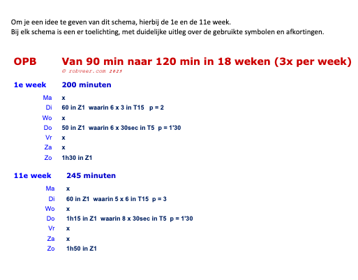 Het schema is geschikt voor hardlopers die zonder problemen 90 minuten lang onafgebroken kunnen hardlopen. Elke week worden er drie hardlooptrainingen gedaan. In 18 weken werk je toe naar een niveau waarop je twee uur onafgebroken kunt hardlopen. Wil je rustiger opbouwen, kies dan de variant ‘in 18 weken’.