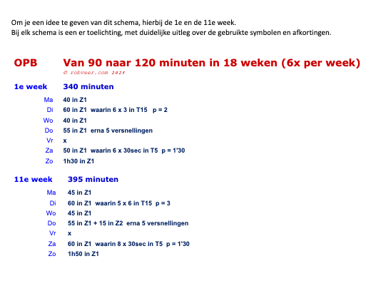 Het schema is geschikt voor hardlopers die zonder problemen 90 minuten lang onafgebroken kunnen hardlopen. Elke week worden er zes hardlooptrainingen gedaan. In 18 weken werk je toe naar een niveau waarop je twee uur onafgebroken kunt hardlopen. Wil je rustiger opbouwen, kies dan de variant ‘in 18 weken’.